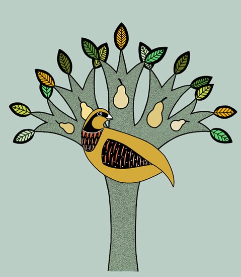A very stylised partridge in a pear tree.